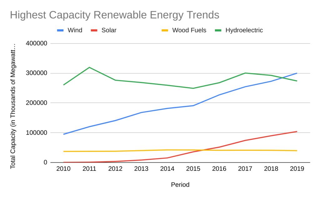 So clearly, solar is growing at a rapid rate. However, harnessing energy from the sun is not the only source of energy that is trending up. In fact, wind energy is the fastest growing renewable power source in the past 10 years. In the chart below, you can see the energy production trends among the highest capacity sources in the United States.