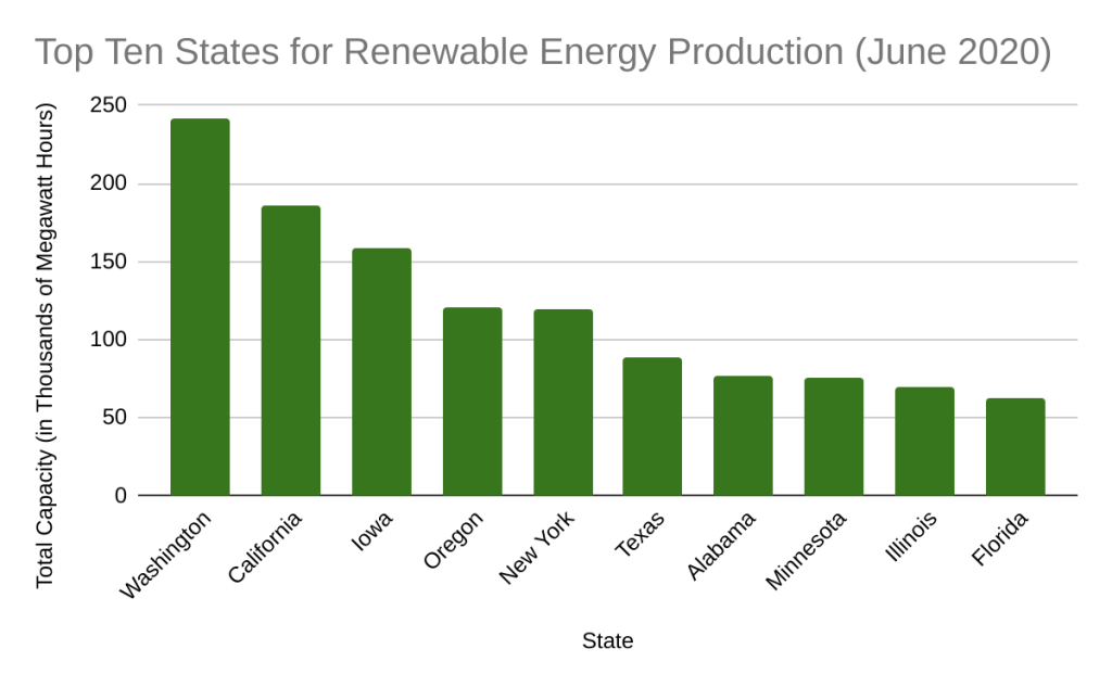 Here, Washington leads the way with nearly 250,000 Megawatt Hours of renewable energy production in June of 2020. This is attributed to about 80% hydroelectric power. In total, Washington makes up just over 10% of the United States current renewable energy production.