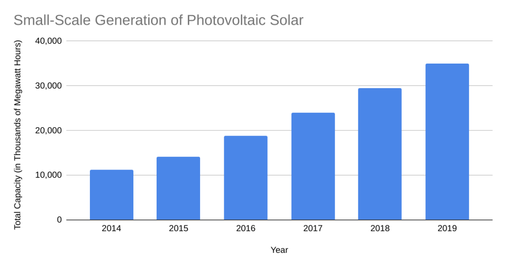 Clearly, home and business sized PV systems are trending up, as thousands of Megawatt hours are being added each year. Although this only contributes a small percentage to the national energy generation, this data is still extremely impressive. In 2019, PV systems on homes and businesses generated almost as renewable energy as utility-scale systems (including those from other sources) did 9 years prior.