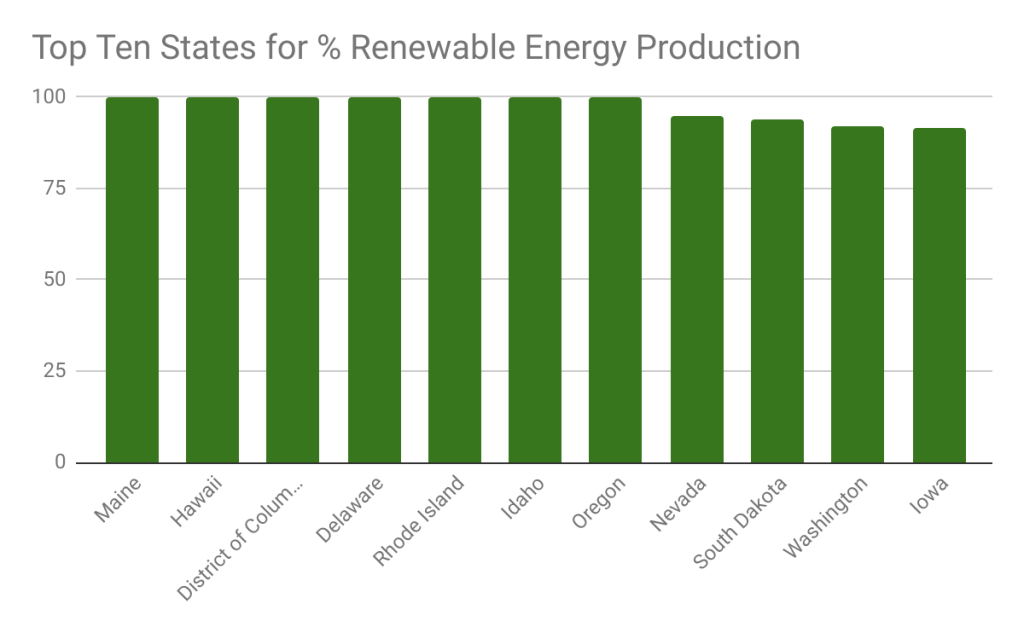 First, let’s take a look at some of the states that are producing almost exclusively renewable energy. In the graph below, you can see the percentage of energy production from renewable resources that each state produces.
