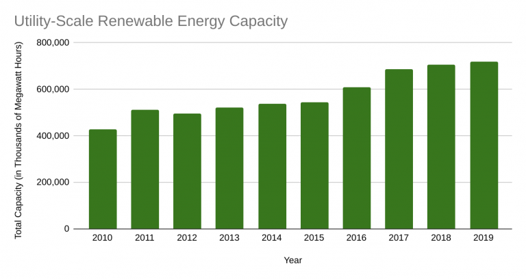 To start, let’s take a look at what’s being done on a large scale. Below, here is a chart that shows the total amount of renewable energy that was generated by utility scale facilities over the past 10 years.
